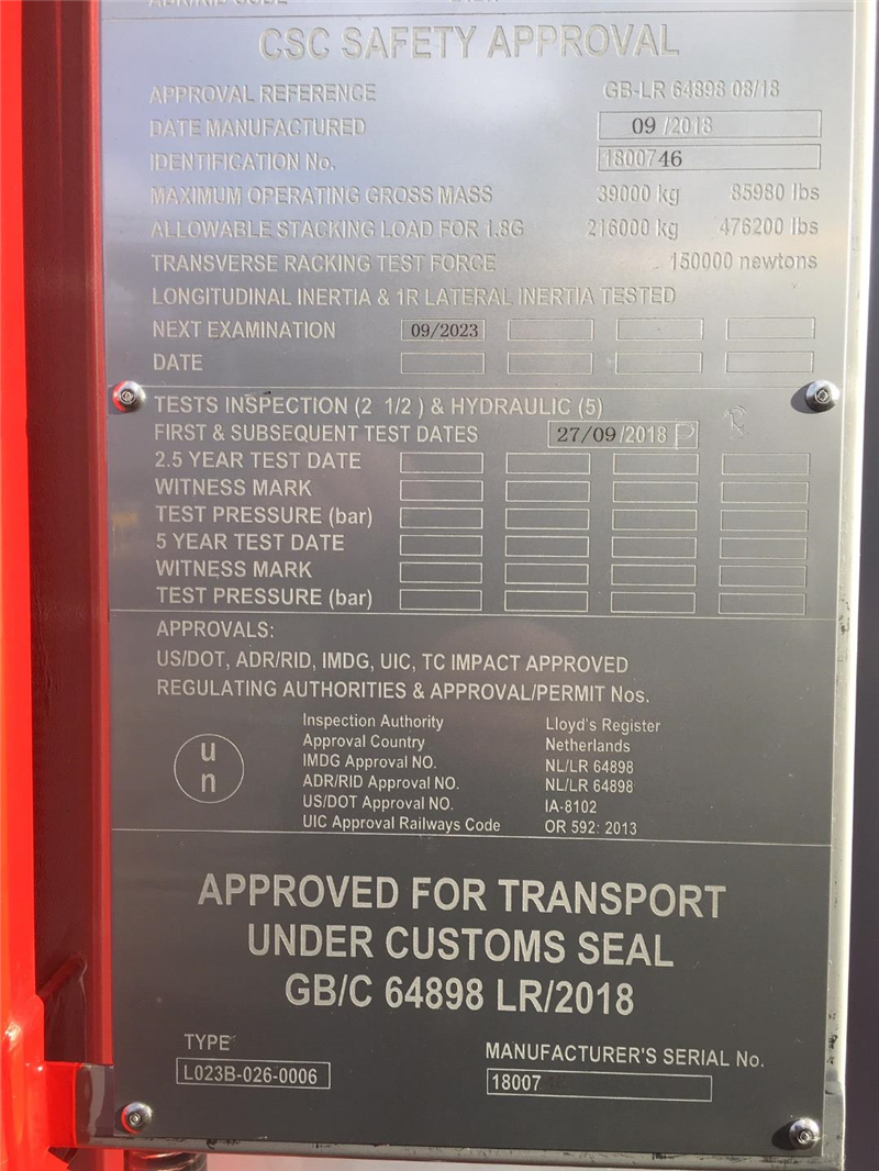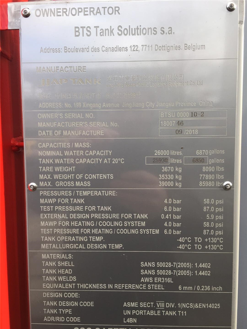 | Ontwerpcode | ASME VIII Div1 & EN14025, where applicable ADR/RID L4BN, UIC, TIR, CSC, ISO1496-3 |
