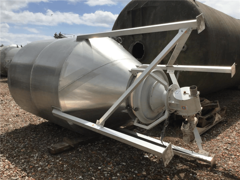 Omschrijving (NL) | Gebruikte silo - Aluminium - 10500L - Kop (1x flens Ø600 mm, 1x flens Ø390 mm, 1x buis Ø80 mm binnen, 1x buis Ø60 mm binnen, 1x gat Ø475 mm binnen) - Cilinder (1x mangat Ø570 mm binnen) - Bodem (trilmotor, draaisluis) |